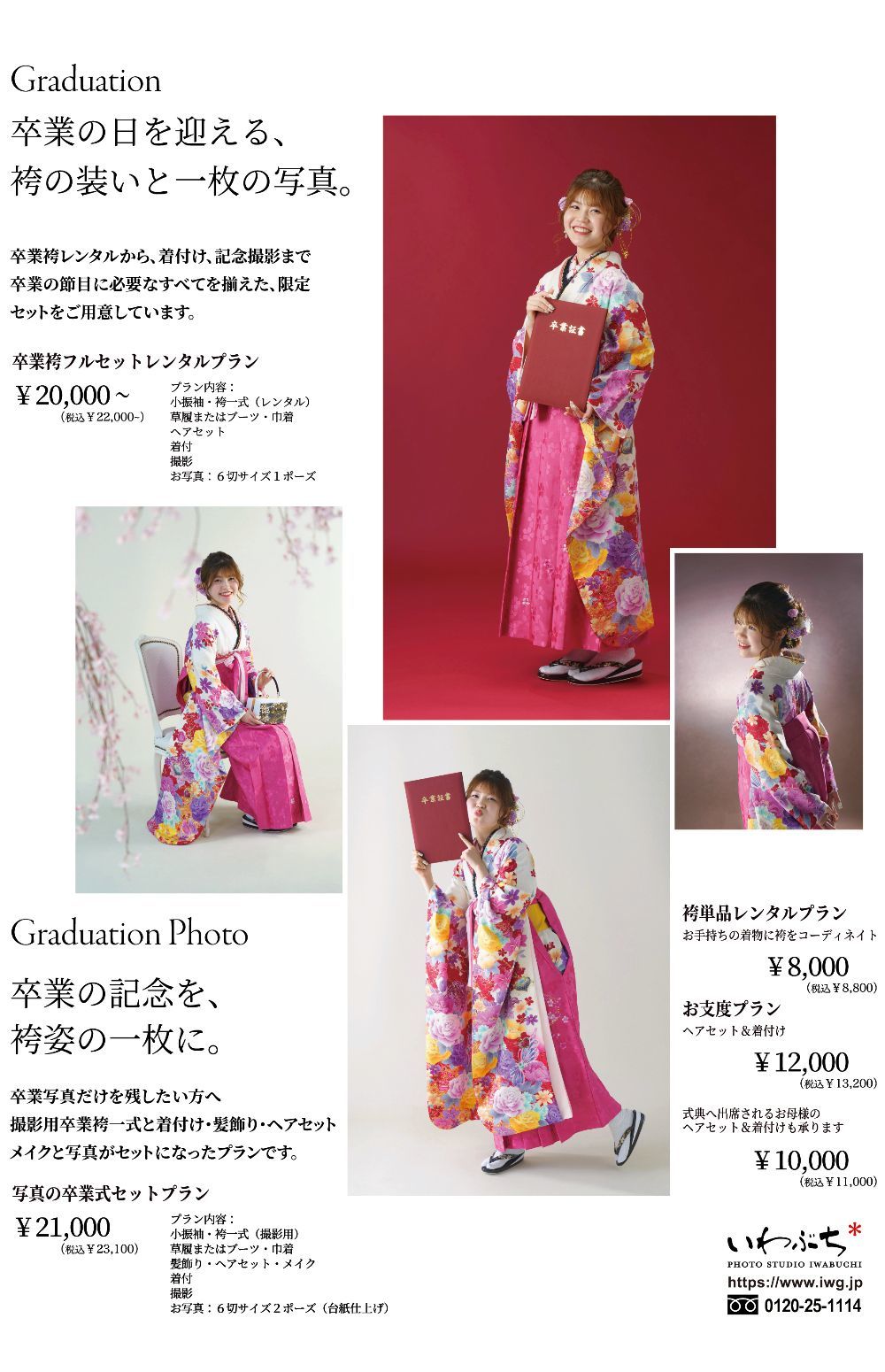 卒業式当日の卒業袴お衣装レンタルと着付け・ヘアセット・草履&巾着・お写真がセットになっています。
